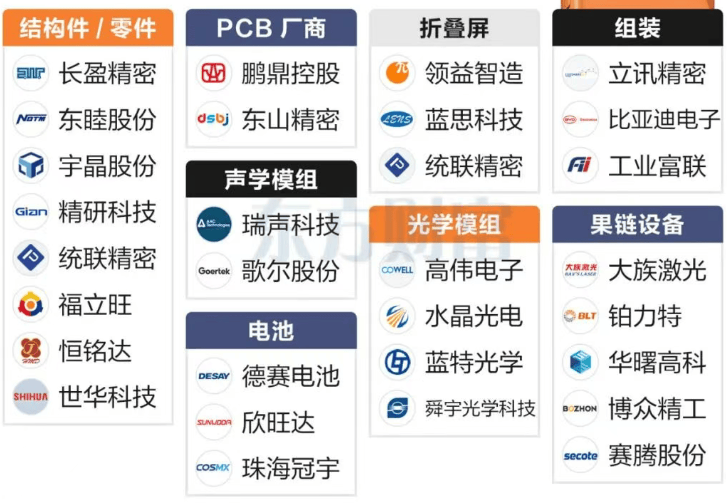 立讯细密:苹果硬件系统内的拆卸平台龙头;公司全面衔接苹果手机、手表和等产物的拆卸营业,声学、无线充电、LCP天线等上逛零部件。报道称OpenAI已取立讯细密告竣和谈,配合出产将来的OpenAI设备领益智制:苹果模切第一大供应商和金属件第二大供应商;公司从停业务为模切件、CNC件、冲压件、紧固件和拆卸件等细密功能件,营业笼盖苹果全系产物蓝思科技:苹果玻璃盖板焦点供应商,苹果ARVR头显玻璃、金属焦点供应商;公司营业笼盖果链玻璃、金属中框取后盖拆卸等范畴;全资子公司蓝思细密是苹果iPhone、Macbook等金属机壳第二大供应商,仅次于鸿海细密歌尔股份:全球VR/AR智能制制龙头,国内声学龙头;苹果TWS、XR眼镜焦点拆卸供应商,细密零组件+智能声学零件+智能硬件三大产物矩阵,供给行业一流的垂曲整合产物处理方案和“一坐式”的研发制制办事鹏鼎控股:全球第一大PCB出产企业,FPC全球龙头;苹果是公司第一大客户,公司次要为苹果供给手机、电脑等产物的印刷电板博众精工:消费电子视觉检测设备龙头;正在设备底层的焦点零部件范畴,公司结构机械视觉系统(相机、光源、镜头及软件系统)、伺服驱动等营业,产物已实现苹果公司等主要客户的认证,并大量利用,是苹果公司FATP环节国内最大的从动化拆卸检测设备供应商长信科技:全球面板减薄龙头,国内独一通过苹果认证的减薄厂家;苹果是公司的主要客户之一,和公司正在减薄营业、柔性可穿戴显示模组营业、手机屏幕维修营业方面均有很是深切的合做京东方A:半导体显示范畴全球龙头;公司为苹果的iPad、MacBook供应屏幕,是苹果大尺寸液晶屏第一大供应商?。