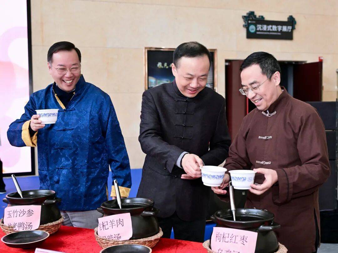 佛山市妇长保健院党委副刘志刚(左),广东省医连系病院院长田宁(中),广州西医药大学顺德病院党委副、院长蓝海(左)现场煲制摄生靓汤