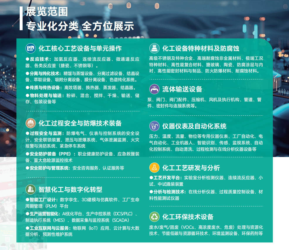 - 化工单位设备:破坏、夹杂、反映、分手过滤、蒸发结晶、换热传热、制冷、输送及包拆设备;- 化工环保设备:污水/废气/VOCs管理系统、固废资本化手艺、膜生物反映器(MBR)、催化燃烧安拆;- 从动化取仪器仪表:DCS/PLC节制系统、AI视觉检测、工业机械人、正在线阐发仪、智能传感器;- 聪慧化工园区:基于物联网、云计较取大数据的园区分析办理平台,涵盖数字孪生、智能安防、无人机巡检等处理方案。