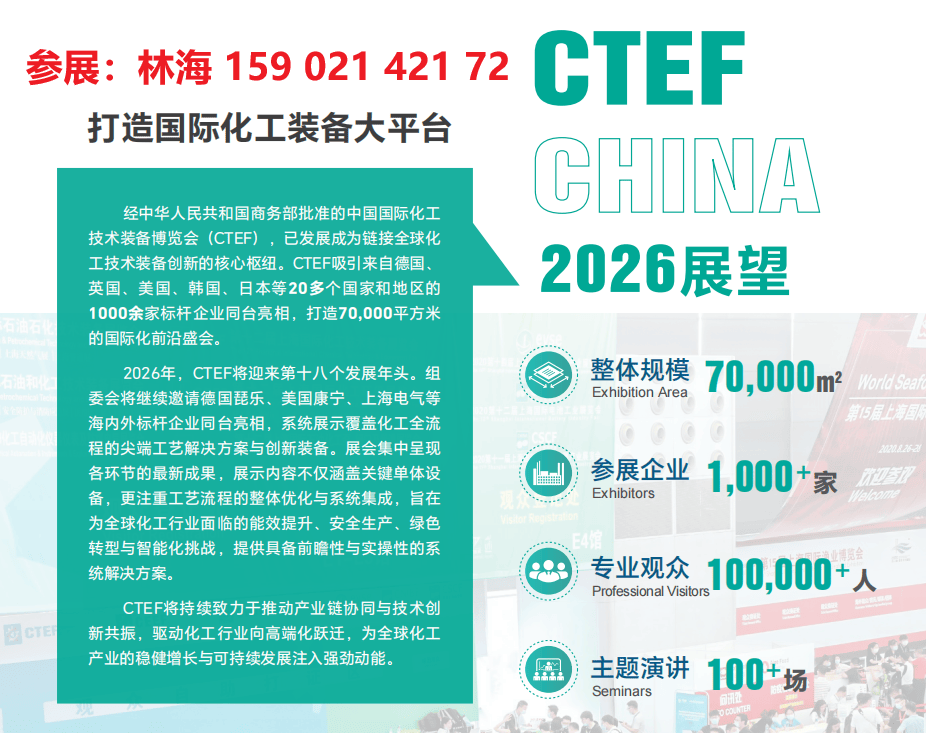2026第十八届上海国际化工配备博览会(CTEF 2026)将于2026年6月9日至11日正在上海新国际博览核心隆沉举行。本届展会经中华人平易近国商务部核准,由中国化工配备协会、振威国际会展集团等多家权势巨子机构结合从办,估计展出头具名积达70,000平方米,吸引来自30多个国度和地域超1,000家参展企业,专业不雅众将冲破10万人次。展会以“绿色·智能·协同”为从题,聚焦“双碳”方针取工业4。0趋向,
