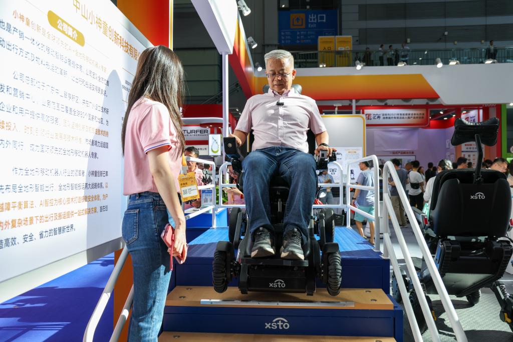 2025年9月12日,正在2025深圳国际聪慧养老财产博览会上,不雅众正在展会现场体验一款能够上下楼梯的智能出行机械人。记者 梁旭 摄。
